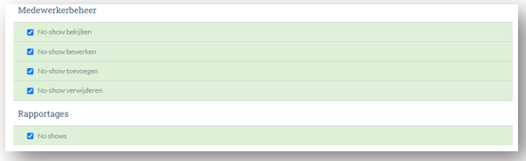 De permissies om No Shows te registreren bij een medewerkers zijn uitgebreid. Er is een splitsing gemaakt om een No Show te kunnen registreren en een geregistreerde No Show aan te passen of te verwijderen.